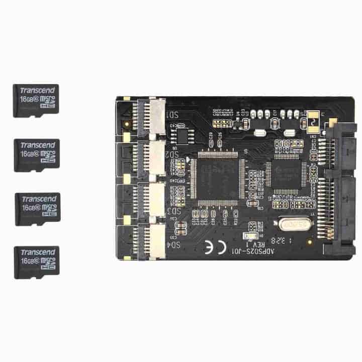 Este dispositivo permite integrar hasta cuatro tarjetas microSD con capacidad máxima cada una de 32 GB para crear un SSD de hasta 128 GB de almacenamiento.