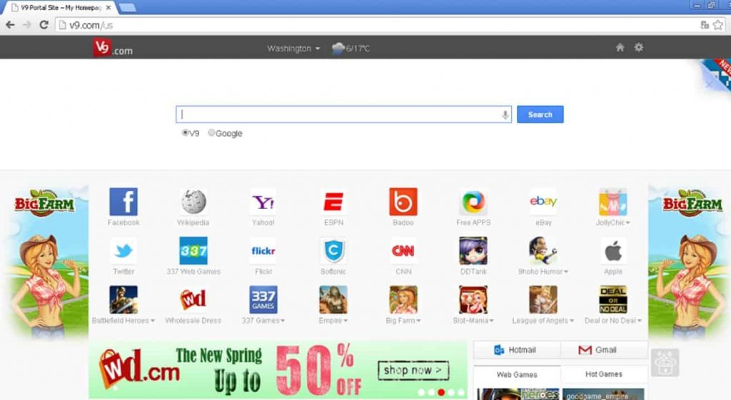 La página de inicio y el buscador por defecto se cambian y tendrás que usar por fuerza v9.com y no la página que tú hayas elegido.