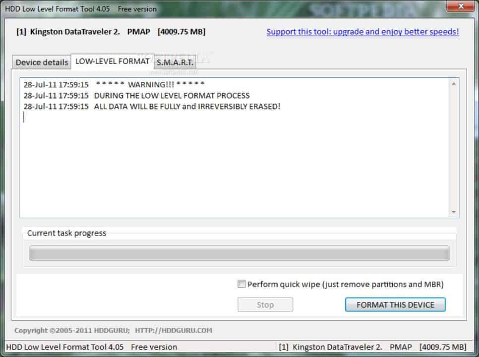 ¡Importante! HDD Low Level Format Tool deja el disco tal y como vino de fábrica, de modo que los datos que tenías almacenados en el disco formateado serán imposibles de recuperar. Resulta muy recomendable tener conocimientos de hardware para saber exactamente lo que se está haciendo antes de utilizar HDD Low Level Format Tool.
